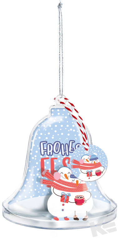 Weihnachtsbaum Anhänger, Glocke, Klarsicht, Acryl, mit Kärtchen, Schneemänner, 10 x 9cm, incl. Geschenkanhänger