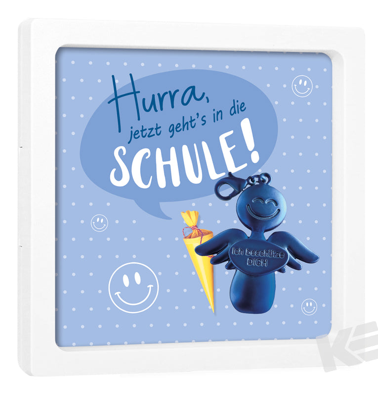 Dekorahmen ca 10 x 10 cm, Sweet little Bodyguards, bestückt mit einem Metallanhänger Engel blau, Hurra Schule - blau, 1 VE = 4 Stück