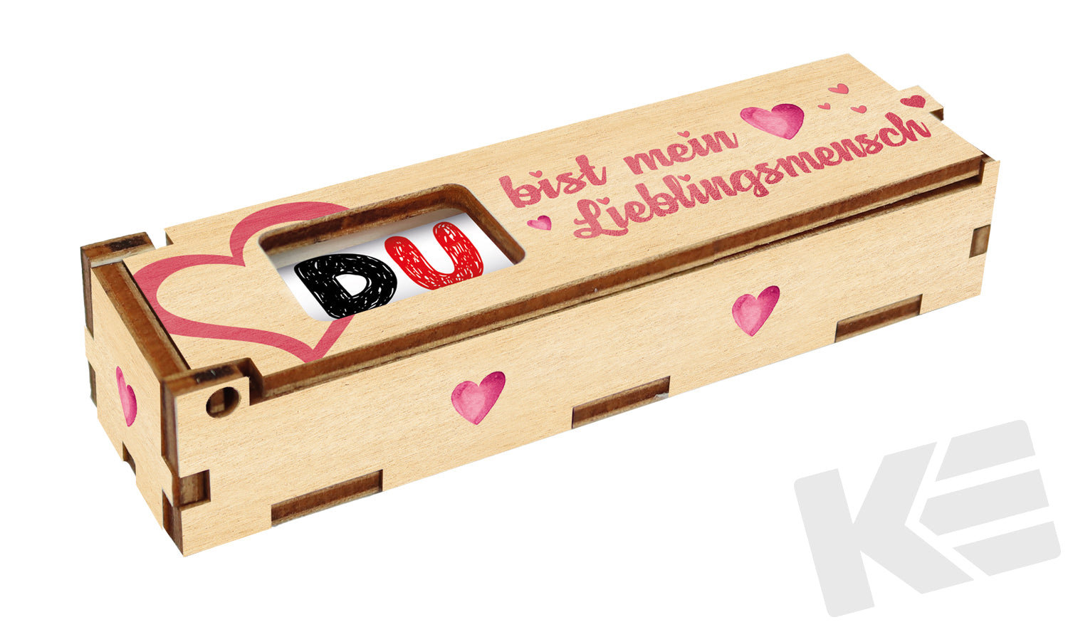 kleine Holz-Geschenkbox für einen Schokoladenriegel mit farbigen Aufdruck, Lieblingsmensch, 123x33X23mm