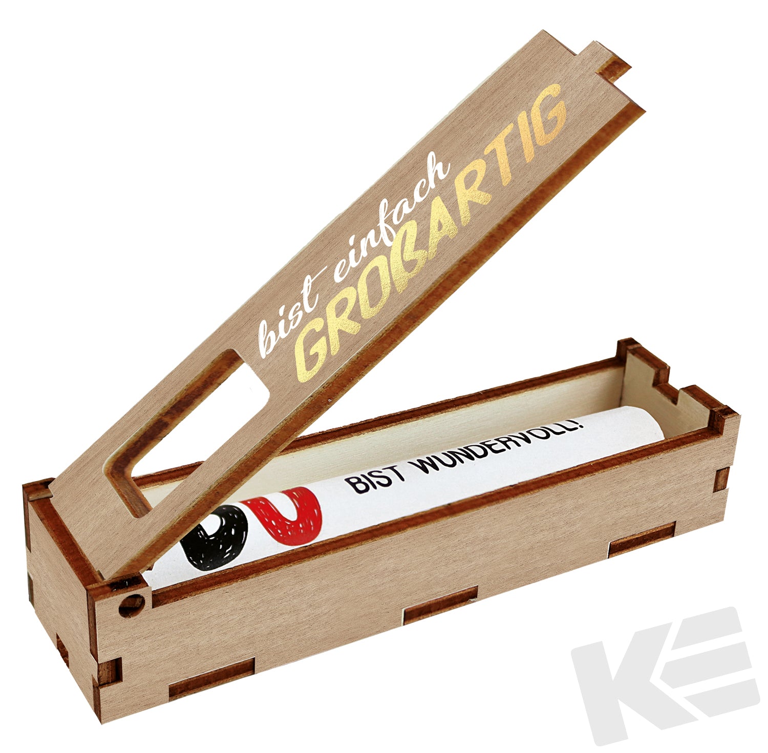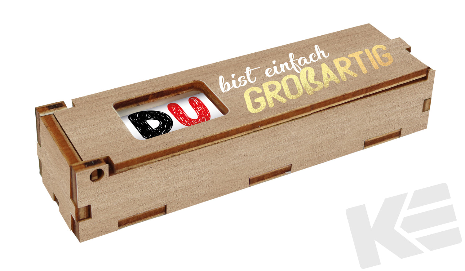 kleine Holz-Geschenkbox für einen Schokoladenriegel mit farbigen Aufdruck, Du bist Großartig, 123x33X23mm
