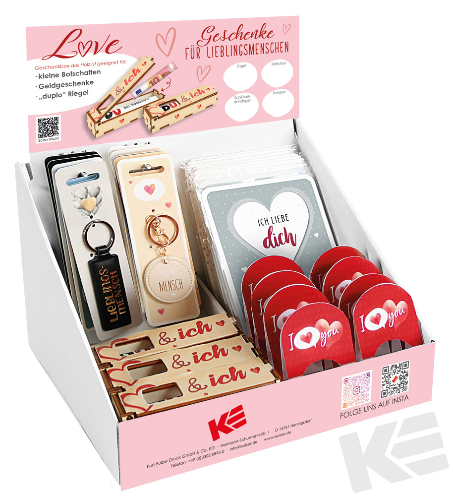 Display Love, das Display enthält verschiedene Geschenkartikel. Holzschachtel für Schokolade, Schlüsselanhänger, Sweet Little Bodyguards und Glückskarten