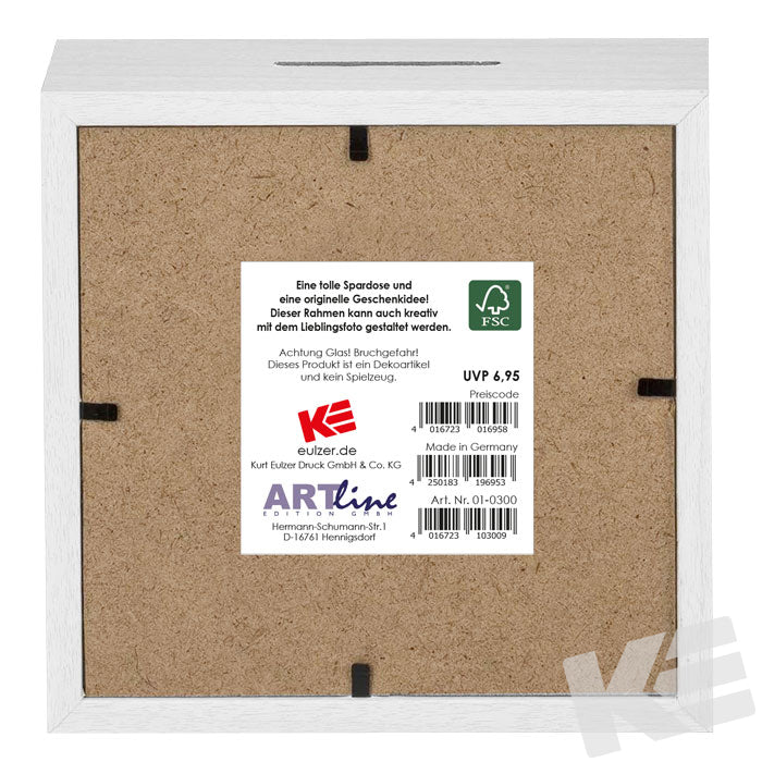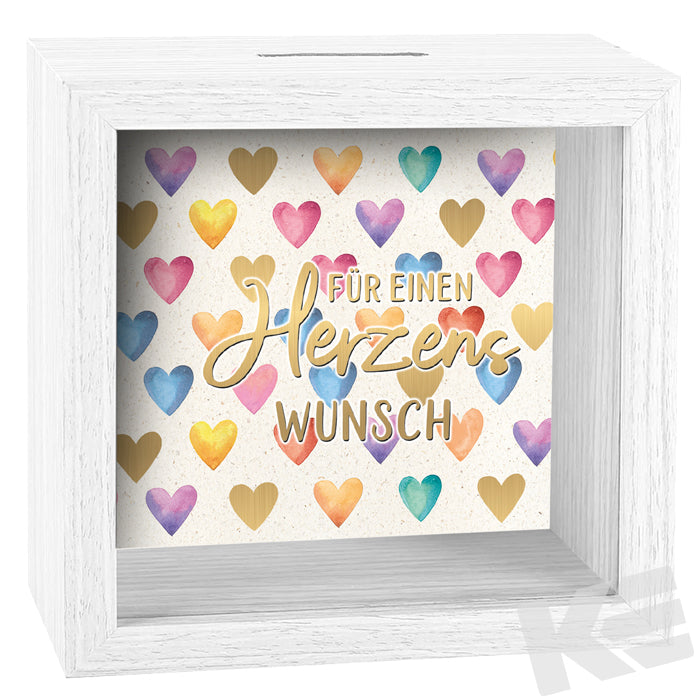 Spardose Holz weiß mit Glasscheibe, Innen bedruckt inkl. Folienveredelung + Folie auf Frontglas, 11x11cm, Herzen