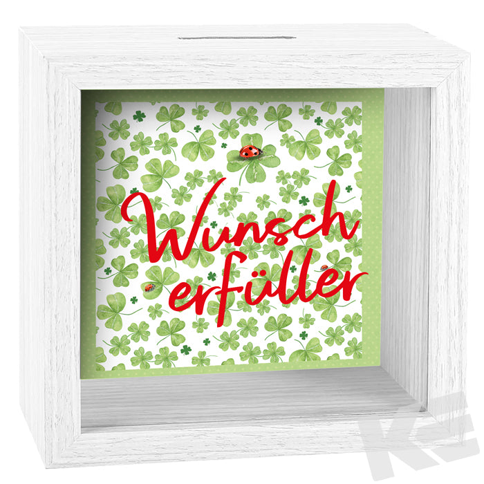 Spardose Holz weiß mit Glasscheibe, Innen bedruckt inkl. Folienveredelung + Folie auf Frontglas, 11x11cm, Kleeblätter