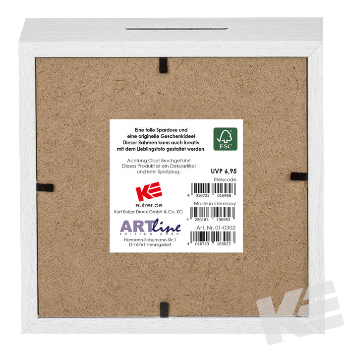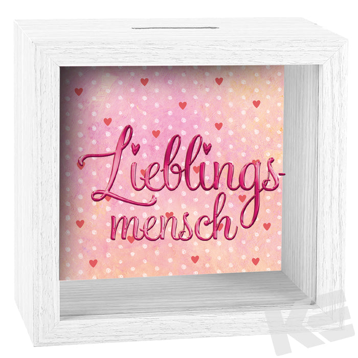 Spardose Holz weiß mit Glasscheibe, Innen bedruckt inkl. Folienveredelung + Folie auf Frontglas, 11x11cm, Herzen