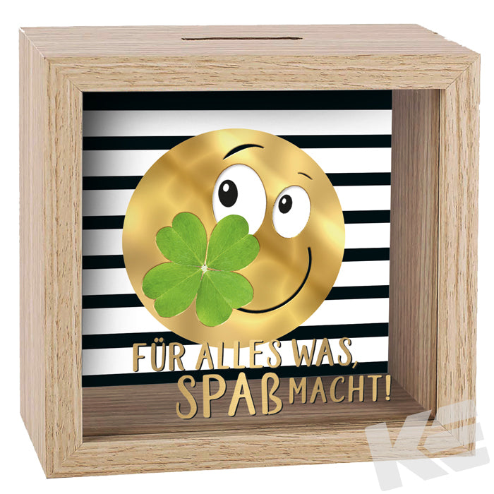 Spardose Holz braun mit Glasscheibe, Innen bedruckt inkl. Folienveredelung + Folie auf Frontglas, 11x11cm, Smiley