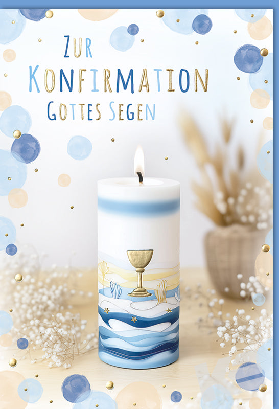 Konfirmation, Druckkarte, weißer Karton, bunt aufgemalte kreise, Kerze mit Motiv, Karte graviert