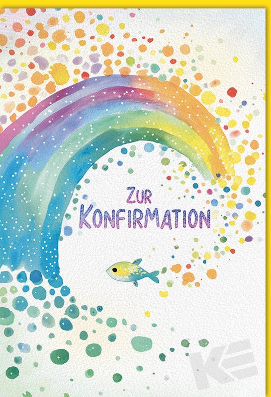 Konfirmation, strukturierter weißer Karton, Druckkarte, gezeichnetes Motiv, bunter Regenbogen, fisch