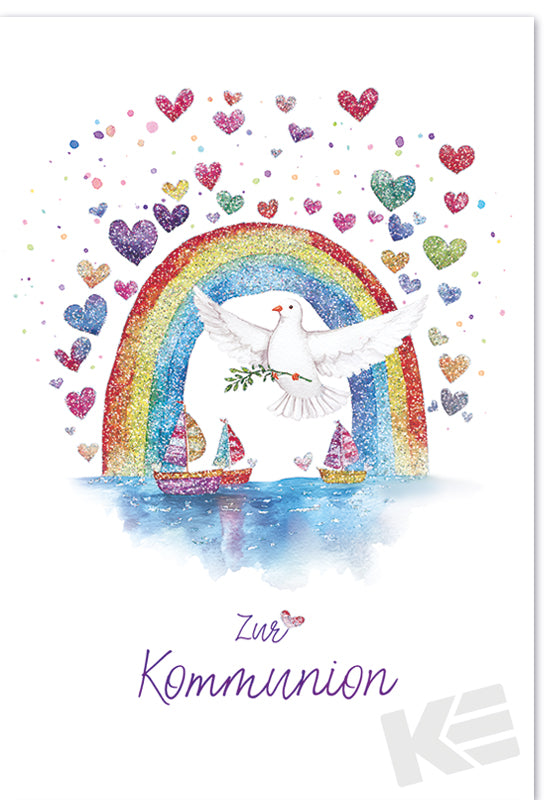 Kommunion, Druckkarte, weißer Karton, Regenbogen, Taube, Herzen, Boote, mit Glimmereffekt