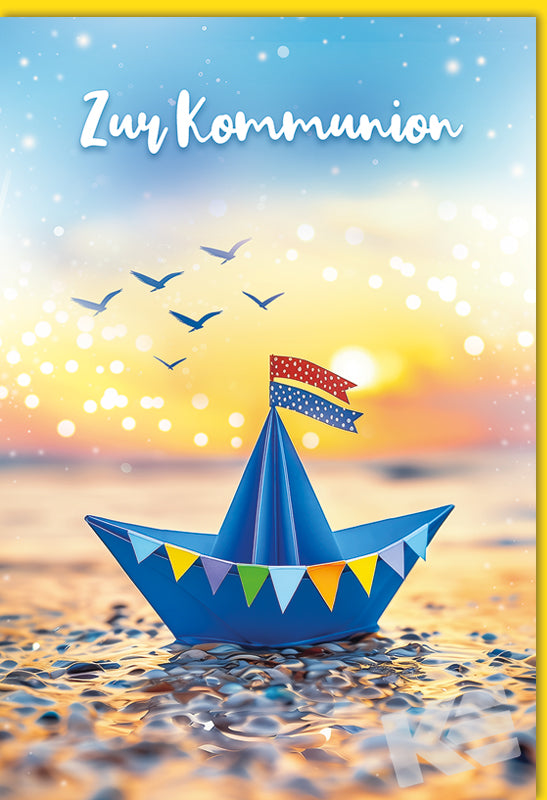 Kommunion, Druckkarte, weißer Karton, Papierboot, Vögel, Wasser