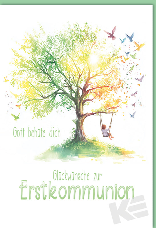 Kommunion, Druckkarte, weißer Karton, Vögel, Baum, Kind, Schaukel