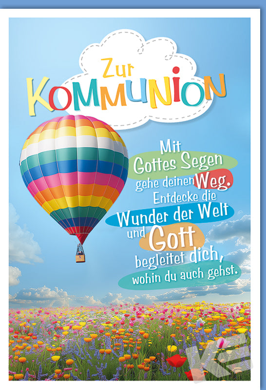 Kommunion, Druckkarte, weißer Karton, Wiese, Heißluftballon