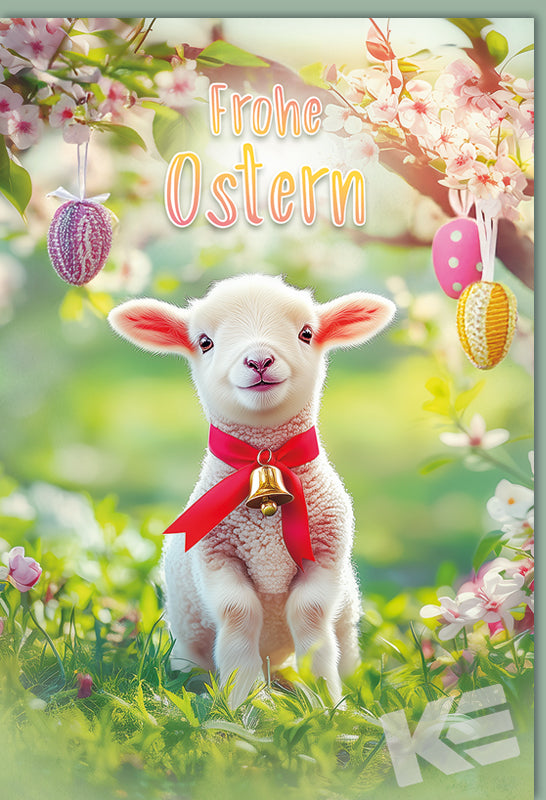 Ostern, Druckkarte, weißer Karton, Lämmchen, Glocke, Ostereier, Wiese