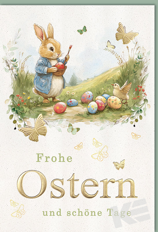 Ostern, Druckkarte, weißer Karton, Hase, Vogel, Schmetterlinge, Ostereier, Karte graviert