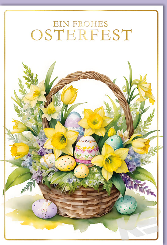 Ostern, Druckkarte, weißer Karton, gemaltes Motiv, Osterkorb, Blumen, Ostereier, Karte graviert