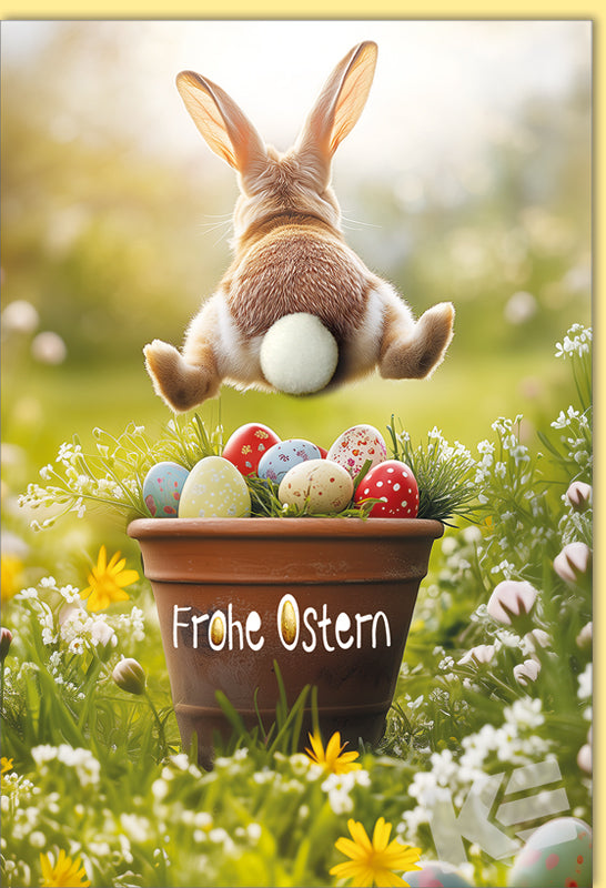 Ostern, Druckkarte, weißer Karton, Blumentopf, Blumen, Ostereier, Haste, Weißer Bommel/Pompom