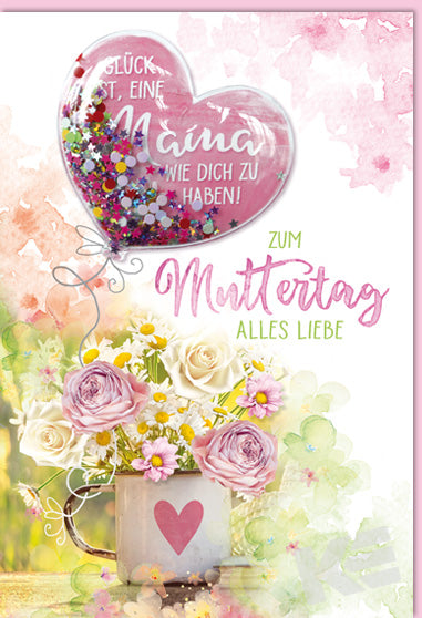Druckkarte, weißer Karton, Blumen, Herz, mit Accessoires, Balloonsticker mit Konfetti
