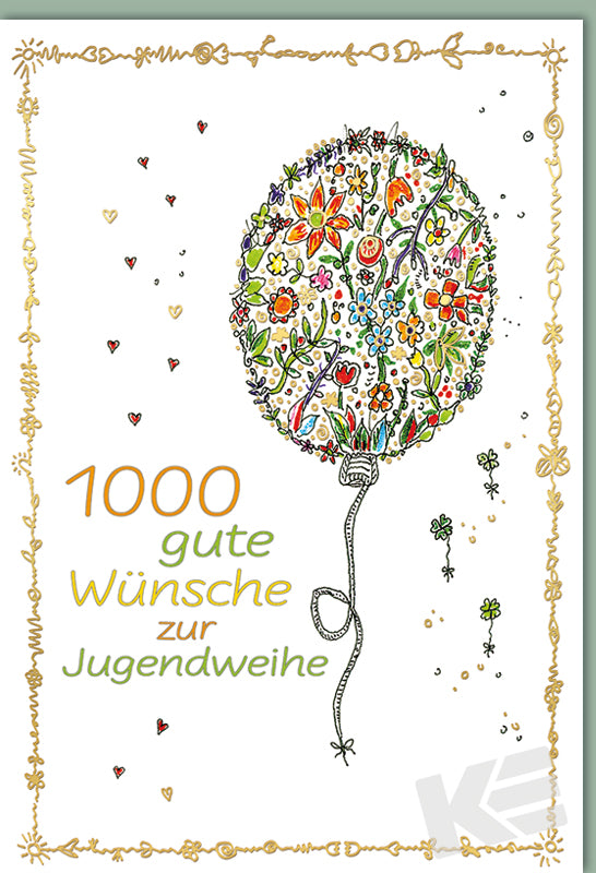 Jugendweihe, Druckkarte, weißer Karton, bunter Ballon, Blumen, Karte graviert