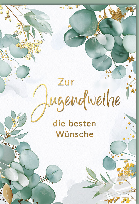Jugendweihe, Druckkarte, weißer Karton, grüne und goldene Pflanzen, Karte graviert