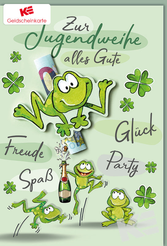 Jugendweihe, weißer Karton, Druckkarte, Kleeblätter, Frösche, Frosch gestanzt, geklebt mit Geldschein