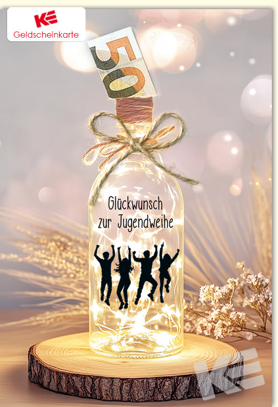Jugendweihe, weißer Karton, Druckkarte, Holzstamm, Weizen, Glasflasche, leuchtend, Juteband, Flaschenhals gestanzt für Geldschein,