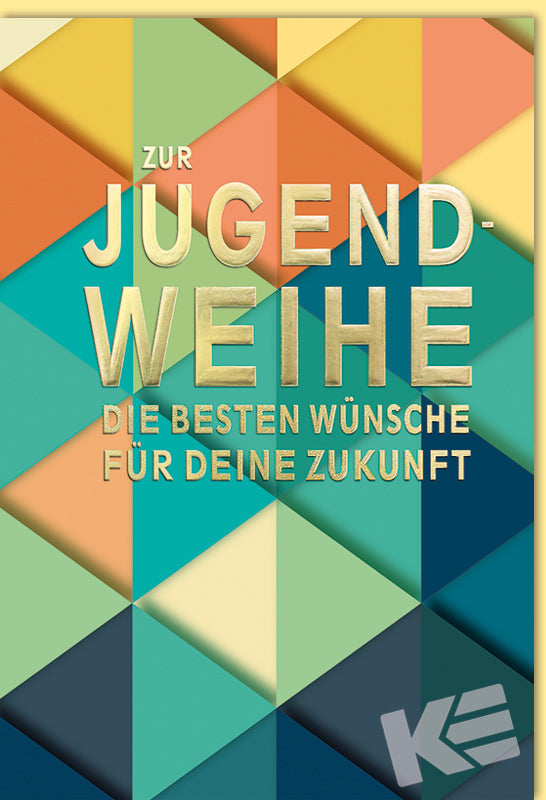 Jugendweihe, Druckkarte, weißer Karton, buntes Rautenmuster, goldene Schrift, Karte graviert