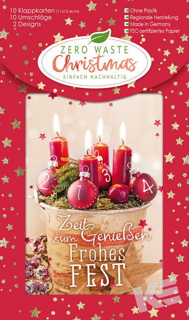 Zero Waste Christmas, 2 Motive, je Motiv 5 Karten, 1VE = 10 Karten in einer Kartonbox zum Anhängen, mit Umschlag, weißer Karton, Druckkarte, 1 Motiv mit Prägung, Topf, Kerzen, Kugeln, 1 Motiv nur Druck, Weihnachtsbaum