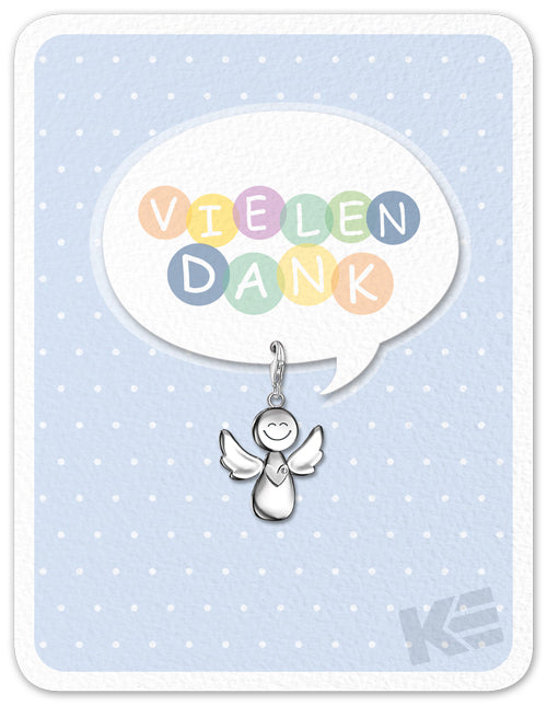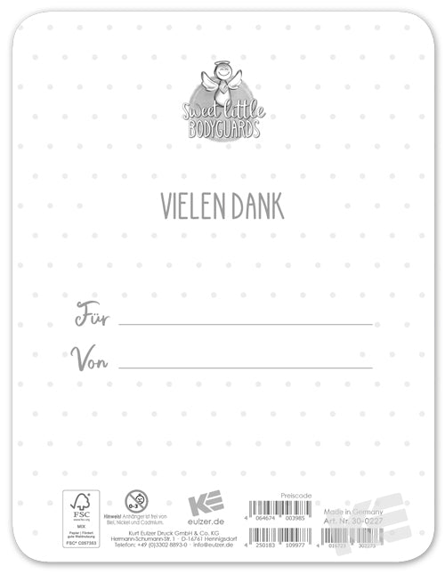 Zusatzprogramm, Glückskarten, Sweet little Bodyguards, strukturierter Karton, Format ca 11,5 x 15 cm, beidseitig bedruckt, mit ein Accessoires, kleiner Metallanhänger, Engel, Stanzteil mit Spruch, Vielen Dank, bunte Schrift,1 VE = 4 Karten