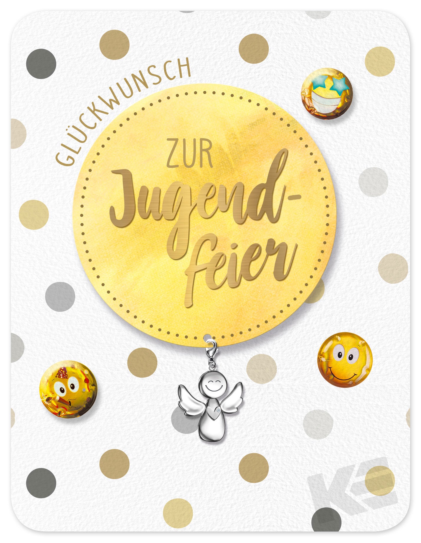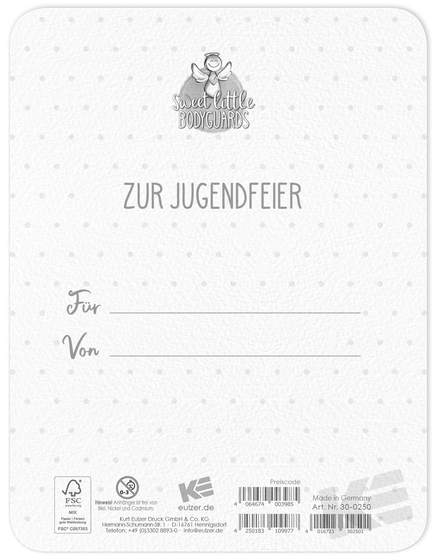 Zusatzprogramm, Glückskarten, Sweet little Bodyguards, strukturierter Karton, Format ca 11,5 x 15 cm, beidseitig bedruckt, mit ein Accessoires, kleiner Metallanhänger, Engel, Stanzteil mit Spruch, Zur Jugendfeier, Smiley,1 VE = 4 Karten