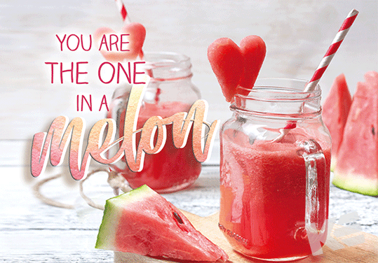Postkarte, Druckmotiv, quer, Melone, Saft, Darstellung in 3D