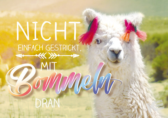 Postkarte, Druckmotiv, quer, Alpaka, mit Bommeln, Darstellung in 3D