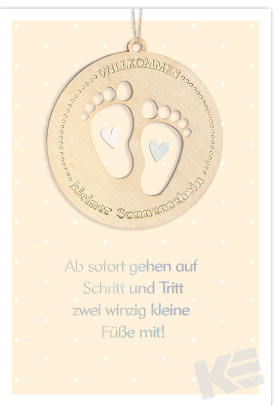 Verkauf nur als Dreher-Konzept , Goodies , Ereignis, Druckkarte, weißer Karton, Karte mit Folienveredlung, mit Accessoires, Holzteil an Juteband, Babyfüße
