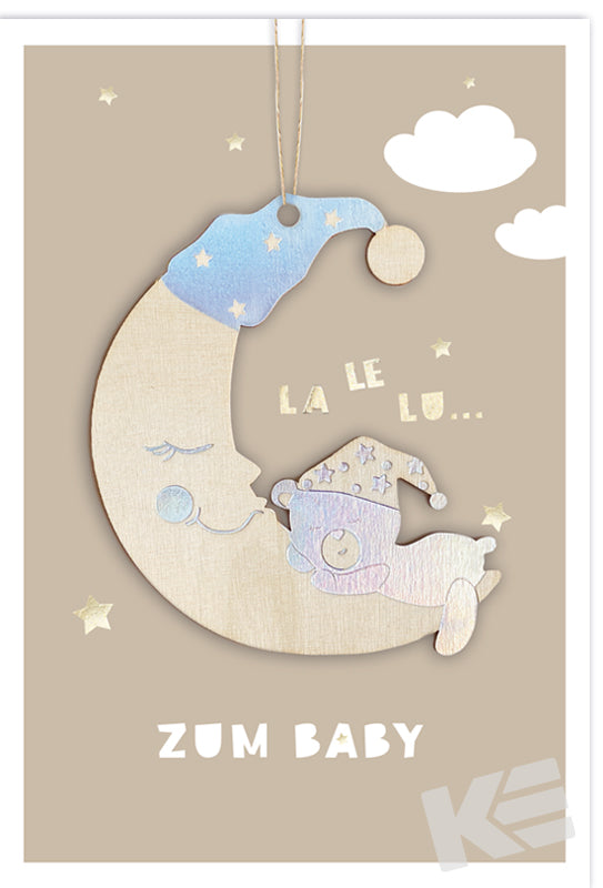 Verkauf nur als Dreher-Konzept , Goodies , Ereignis, Druckkarte, weißer Karton, Karte mit Folienveredlung, mit Accessoires, Holzteil an Juteband, Mond, Teddybär