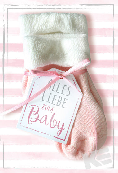Druckkarte, weißer Karton, beidseitig bedruckt, bestückt mit 1 Lätzchen rosa und einem kleinen Metallengel mit Herz und Haken, verpackt in einem Cellobeutel