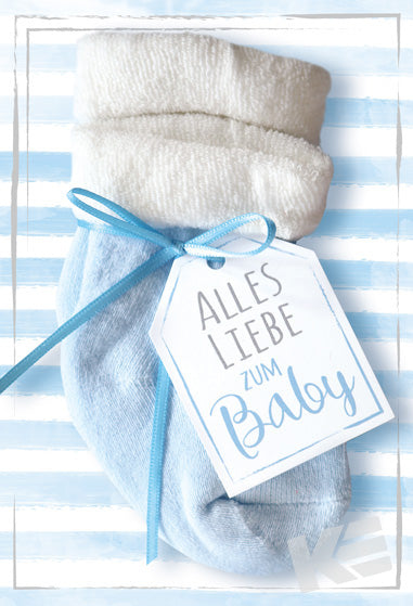 Druckkarte, weißer Karton, beidseitig bedruckt, bestückt mit 1 Lätzchen blau und einem kleinen Metallengel mit Herz und Haken, verpackt in einem Cellobeutel