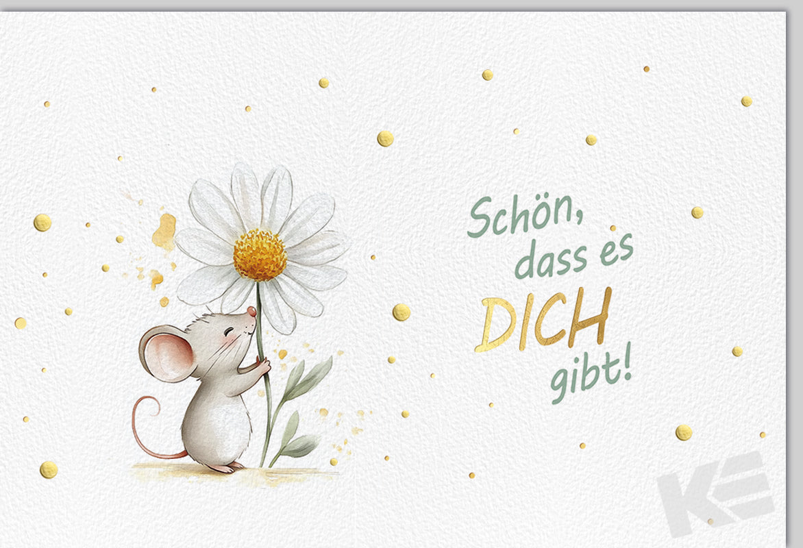 Verkauf nur als Dreher-Konzept, Allgemeine Wünsche, Beautiful Green, QUER, strukturierter weißer Karton, Druckkarte, mit Prägung, der Natur zuliebe unverpackt, Maus, Gänseblume