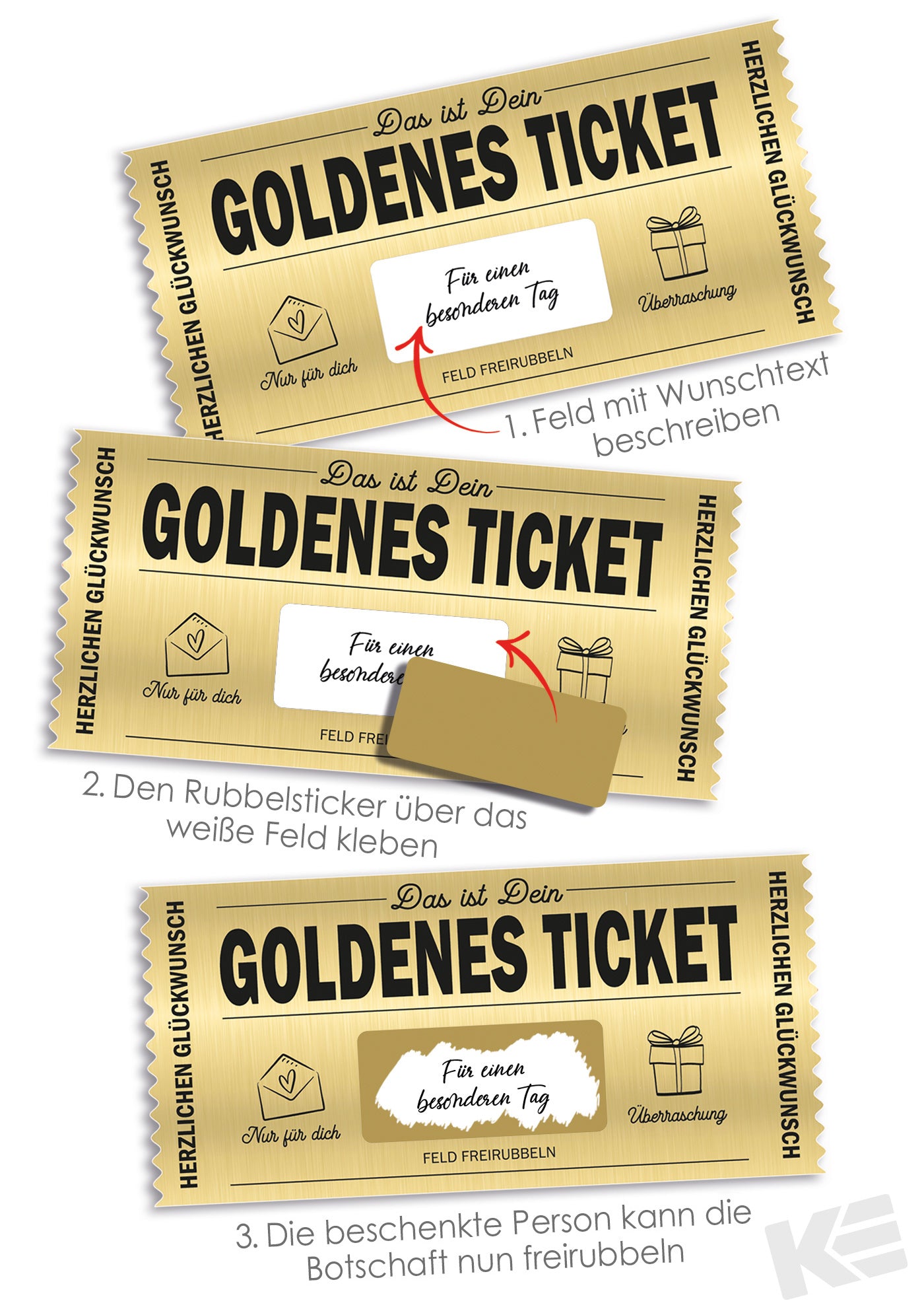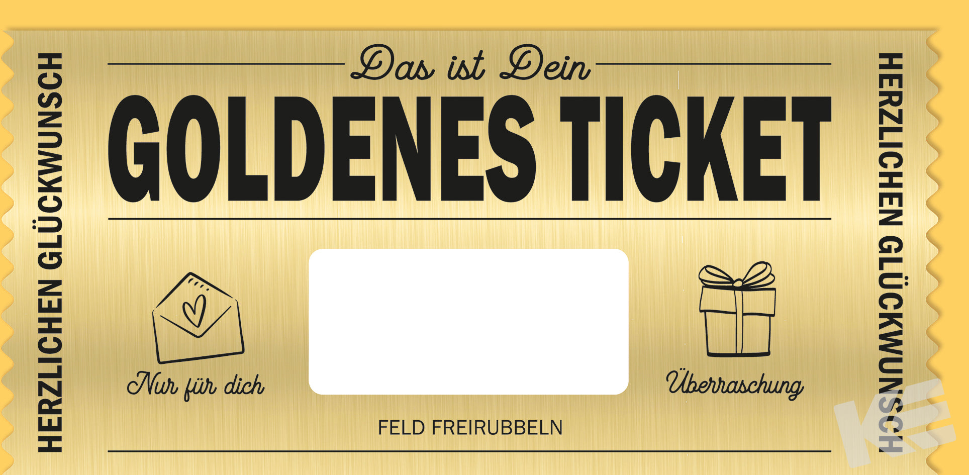 Goldenes Ticket DIN Lang, 350 g/m² Papier, Größe der Karte 200x95 mm, mit Goldfolie auf der Vorder und Rückseite, 1-farbig schwarz bedruck, Verpackt in Cello mit einem goldenen Umschlag, mit Rubbelsticker 70x33mm und einen Infozettel 200x95mm beidseitig