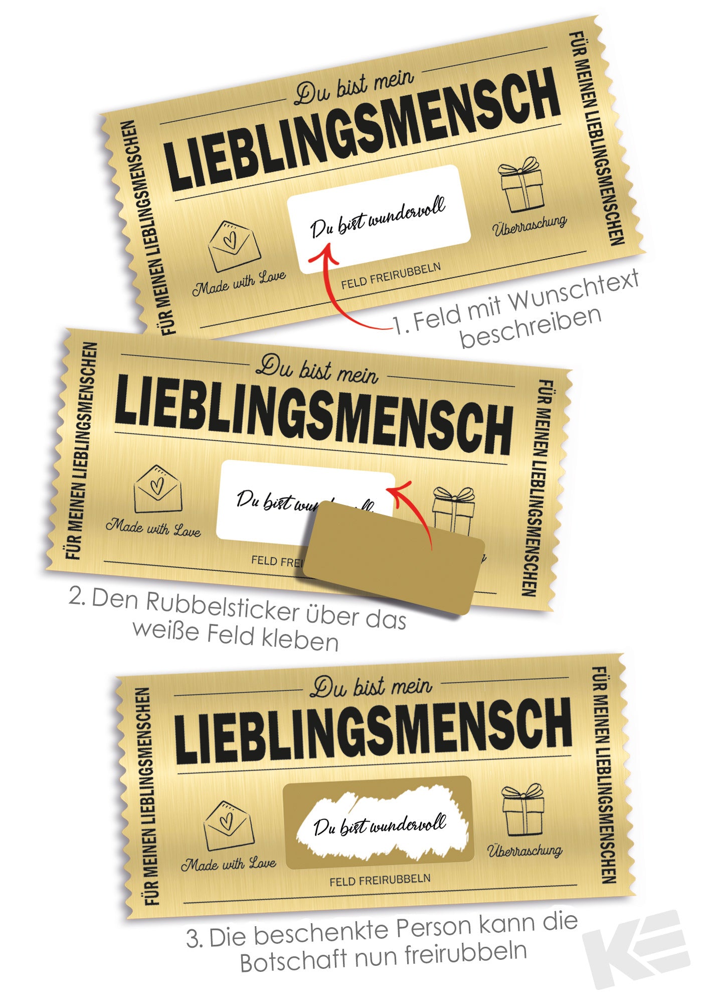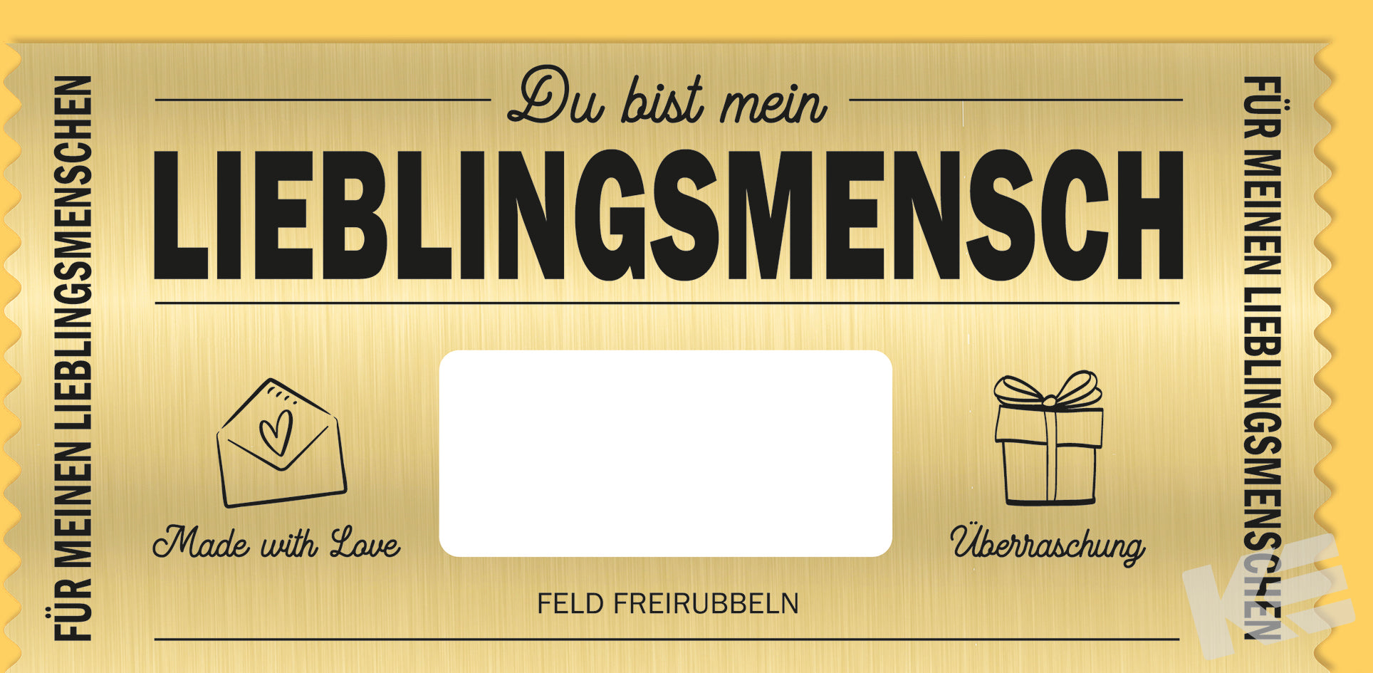 Lieblingsmensch Goldenes Ticket, DIN Lang, 350 g/m² Papier, Größe der Karte 200x95 mm, mit Goldfolie auf der Vorder und Rückseite, 1-farbig schwarz bedruck mit Lieblingsmensch, Verpackt in Cello mit einem goldenen Umschlag, mit Rubbelsticker 70x33mm und