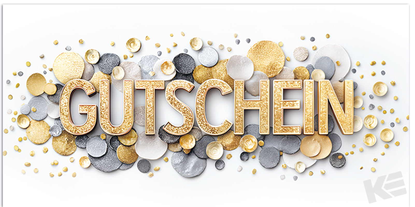 Druckkarte, weißer Karton, DIN Lang, Gutschein, Kreise silberne, goldene Punkte