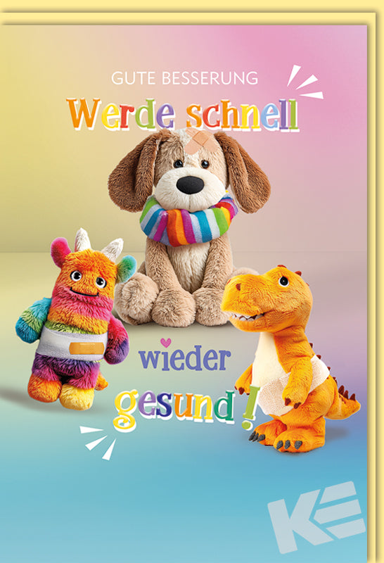 Genesung, Druckkarte, weißer Karton, Bunte Plüschtiere,