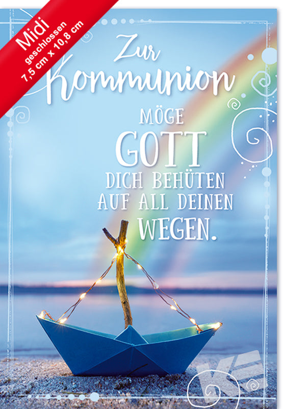 Midigrußkärtchen Konfirmation,weißer Karton, Druckkarte, Papierboot, gemaltes Motiv, leuchtender Mast