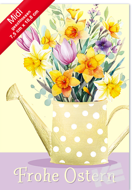 Midigrußkärtchen Ostern,weißer Karton, Druckkarte, Blumen, goldene Gießkanne, Karte graviert