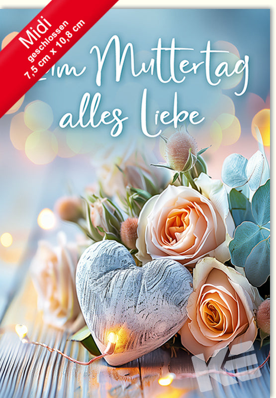 Midigrußkärtchen Muttertag,weißer Karton, Druckkarte, Rosen, Holzherz, leuchtende blumen,