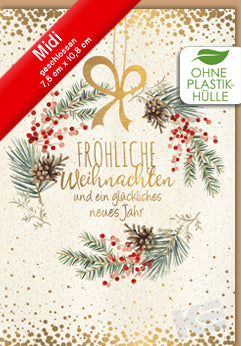 Druckkarte, strukturierter weißer Karton, Motiv gezeichnet, Weihnachtskranz, Tannenzweig