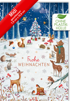 Druckkarte, strukturierter weißer Karton, Motiv gezeichnet, Tiere, Tannenbaum