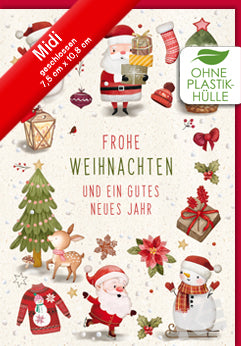 Druckkarte, strukturierter weißer Karton, Motiv gezeichnet, Weihnachtsmänner, Schneemänner
