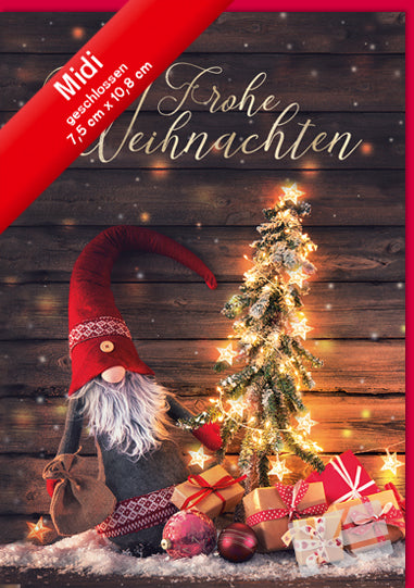 Midigrußkarte, Druckkarte, weißer Karton, Wichtel, Weihnachtsbaum, Geschenke, frohe Weihnachten