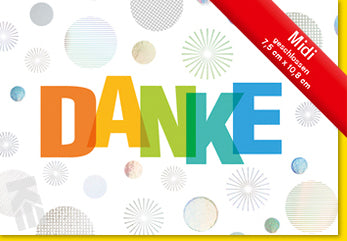 Midigrußkarte, Druckkarte, weißer Karton, bunte Schrift, quer