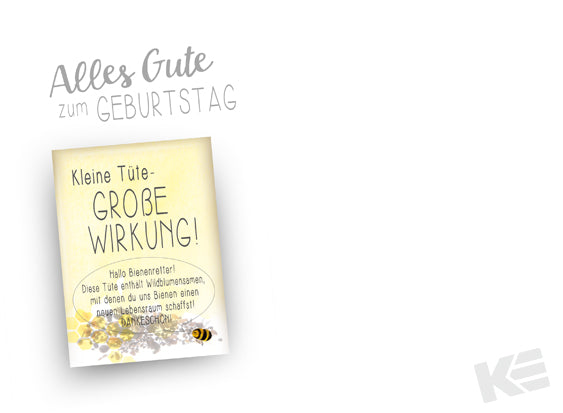 Geburtstag, hochwertiger Karton, Bee Happy, mit Innentext, Karte mit Accessoieres, Blumensamen als Bienenretter, Tüte für den Blumensamen aus Pergament, bedruckt, Druckmotiv, Prägetext, Bienen, Regenschirm, Regentropfen