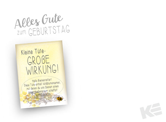Geburtstag, hochwertiger Karton, Bee Happy, mit Innentext, Karte mit Accessoieres, Blumensamen als Bienenretter, Tüte für den Blumensamen aus Pergament, bedruckt, Druckmotiv, Prägetext, Bienen, Waben