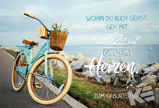 Geburtstag, Druckmotiv, weißer Karton, Karte im Querformat, 3D-Effekt, Fahrrad, Meer, Steine